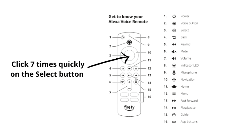 4. Click on the Select Button of your Fire TV Stick Remote quickly 7 times while the name of your device (e.g. ‘Fire TV Stick Lite’, ‘Fire Stick 4K Max’ etc.) is selected.