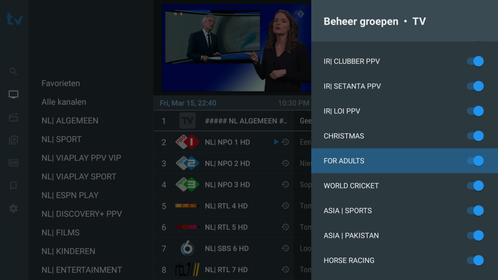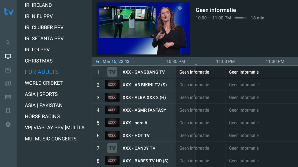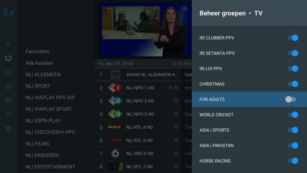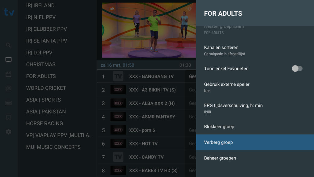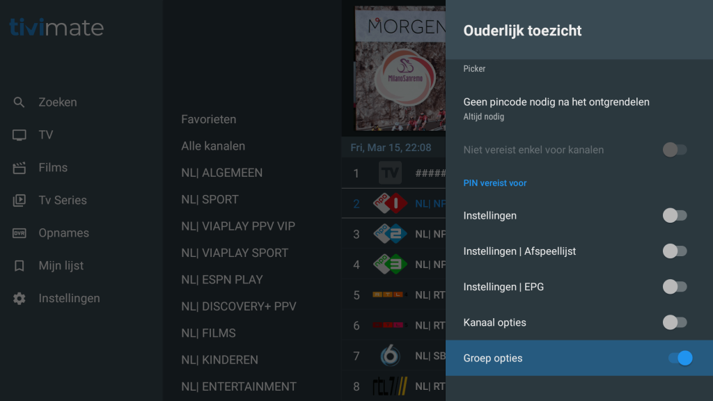 We give you many choices in TV channels, series and films. This also includes 18+ (adult) channels. You may not need these channels yourself or you may not want them to be visible to your children. Therefore, in TiviMate you can disable this group of channels or other groups of channels and enable a password to see the group of channels in TiviMate Premium. Below is an explanation of how to set this password.